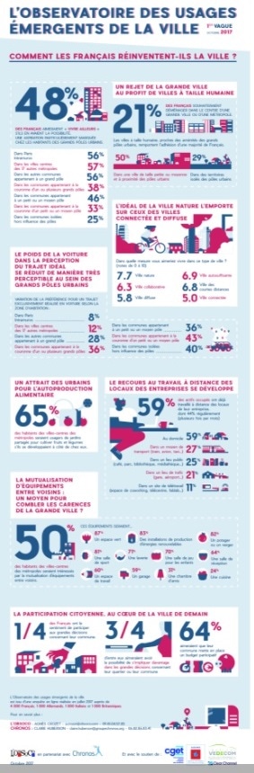 Cet observatoire s’appuie sur une vaste enquête réalisée en ligne auprès d’un échantillon représentatif de la population française âgée de 18 à 70 ans de plus de 4000 personnes, interrogées du 3 au 31 juillet 2017. Afin d’établir des comparaisons internationales (se limitant au niveau européen en ce qui concerne cette première édition), l’enquête a parallèlement été conduite en Allemagne, en Italie et au Royaume-Uni, avec à chaque fois un échantillon de 1000 personnes représentatif de la population nationale. On y observe l’évolution des représentations de la ville au sein des populations du territoire, le développement de nouvelles formes d’aspirations en matière de lieu de vie et l’émergence d’autres pratiques en matière de mobilité, de consommation, mais également de sociabilité et d’échanges.