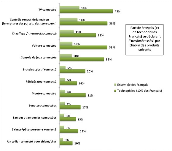 Certaines populations, plus technophiles, semblent naturellement plus en affinité avec les objets connectés que d’autres. Ainsi, les hommes le sont davantage que les femmes, les jeunes (en particulier les moins de 25 ans) davantage que les populations plus âgées et les catégories socioprofessionnelles supérieures davantage que les catégories socioprofessionnelles modestes.