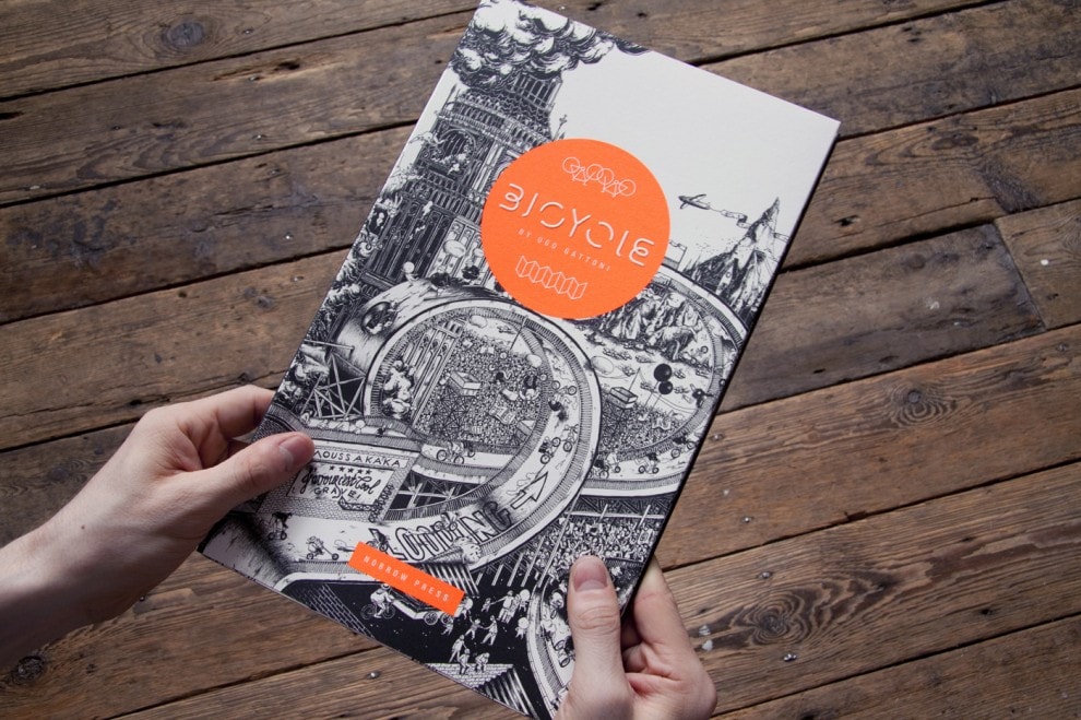 Bicycle est un livre géant sous forme de dépliant qui vous laisse découvrir une extraordinaire illustration réalisée par Ugo Gattoni. Le sujet : les bicyclettes à Londres. Une très belle innovation graphique et picturale.
