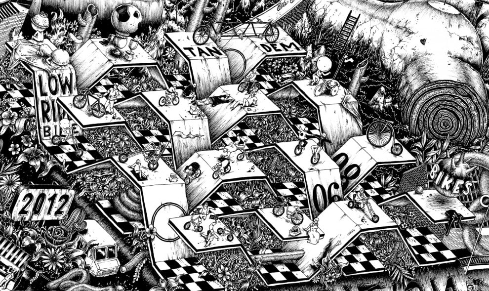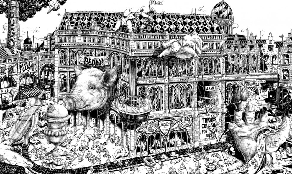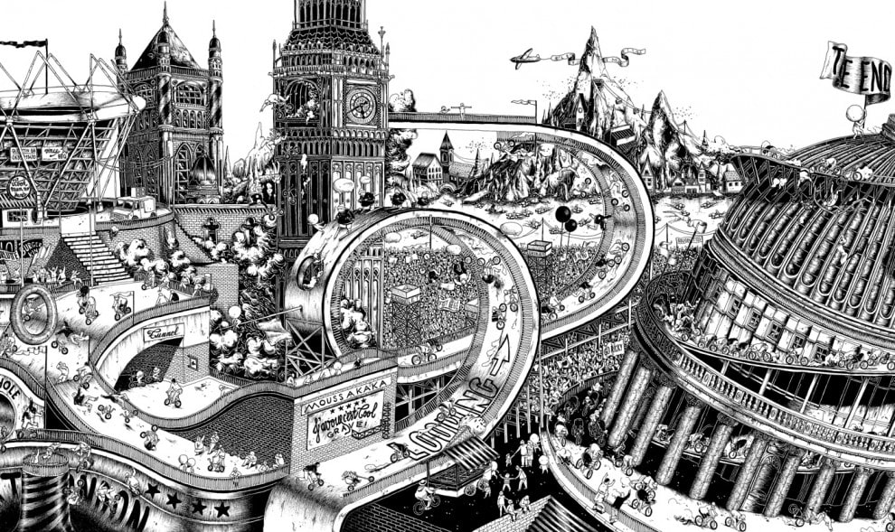 Inspiré par les Jeux Olympiques 2012, le jeune artiste Ugo Gattoni illustre finement « la » course cycliste à travers les rues de Londres : des athlètes-élites aux coursiers, des « navetteurs » aux livreurs, des mamans avec leurs enfants aux  jeunes en VTT. Vous allez vous rendre compte que ce n’est pas une course sur route ordinaire !