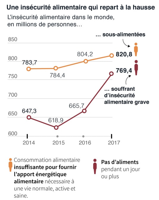 Sur le plan mondial, le nombre de ventres vides a retrouvé en 2017 son niveau « d’il y a dix ans », ce qui confirme « l’inversion de la tendance à la baisse » de la faim dans le monde, engagée depuis 2015.