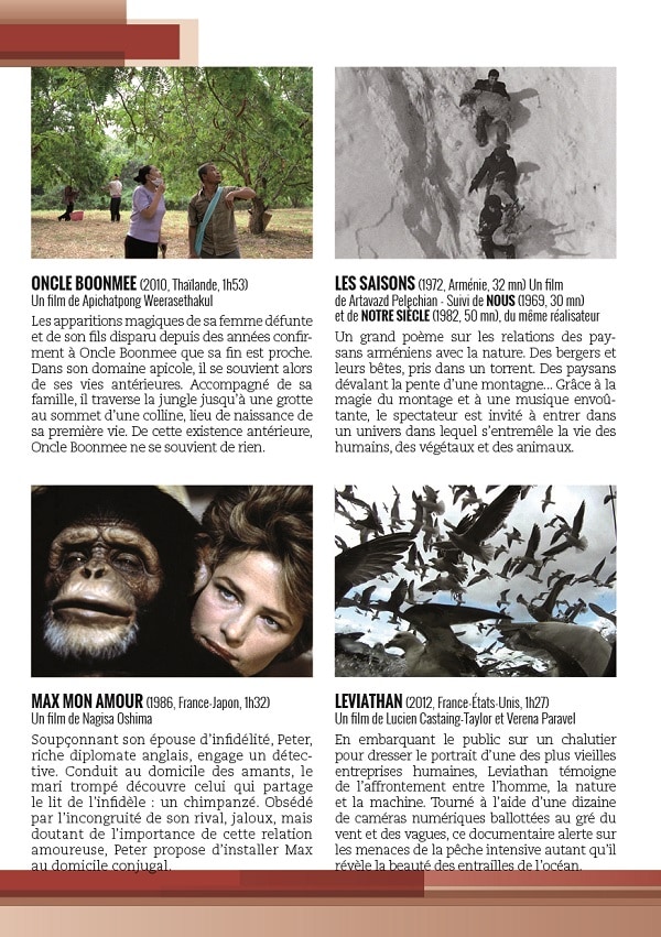 C’est à l’exploration de la variété et de la complexité de ces relations que les spectateurs sont conviés en assistant aux films-débats de la programmation Les Formes de vie au cinéma. Lors de chaque séance, un spécialiste présentera les enjeux esthétiques, sociétaux, philosophiques ou scientifiques liés au film projeté et il animera une discussion avec les spectateurs.