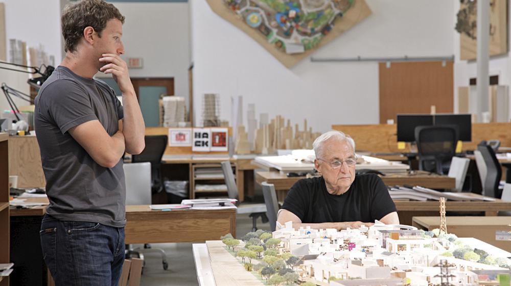 Le patron de Facebook Mark Zuckerberg et l’architecte Frank Gehry, devant la maquette d’un projet de campus, à Menlo Park (Californie)- Crédit photo : FACEBOOK / AFP