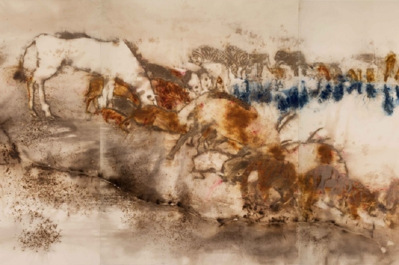 La même fragilité s’exprime au rez-de-chaussée avec la vaste fresque du Chinois Cai Guo Qiang, réalisée avec de la poudre explosive, qui est enflammée – de manière courte et maîtrisée – lors de la fabrication. Il s’agit d’un rassemblement de mammifères autour d’un point d’eau (blanc). C’est le temps de s’abreuver mais dans un moment apocalyptique. Car le point d’eau est un vortex, un vide blanc qui aspire tout ce qui l’entoure et donne naissance à un néant silencieux.