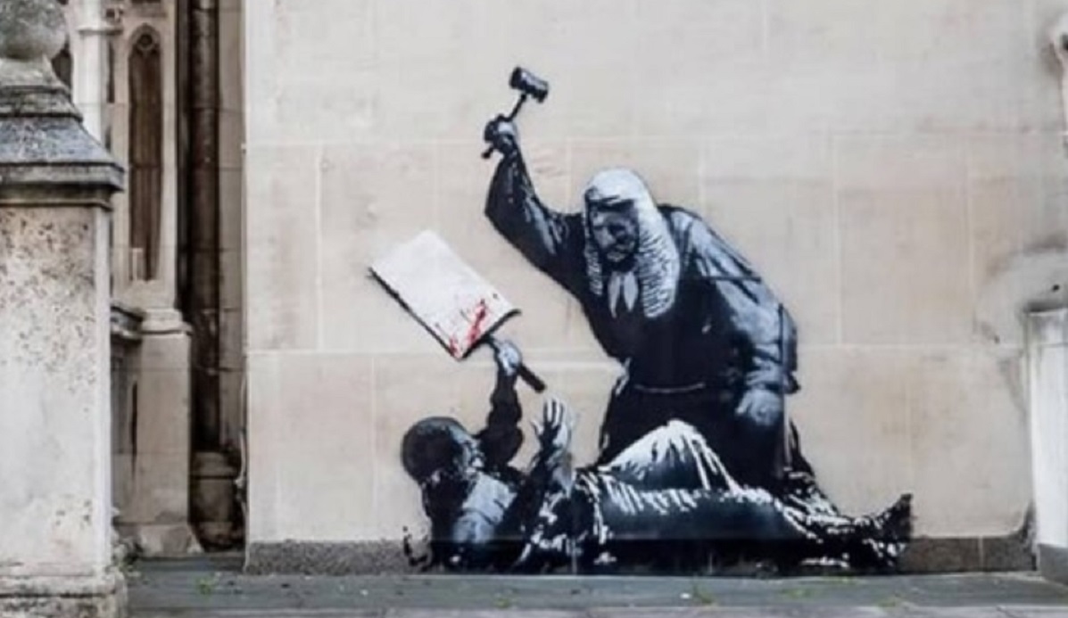 Image d’en-tête : Oeuvre de Banksy sur la façade de la Cour royale de justice de Londres le 8 septembre 2025 qui a été effacée par les autorités.