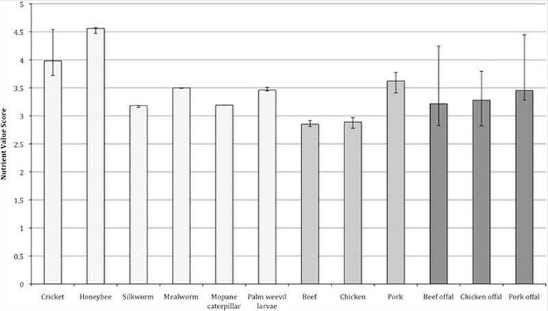 Les résultats sont sans appel. Les insectes toutes catégories sont aussi, voire plus nutritifs que les viandes que nous avons l’habitude de consommer. Si dans la méthode Ofcom les niveaux décelés sont sensiblement les mêmes pour les insectes et pour les viandes, en revanche, la méthode NVS fait apparaître une supériorité des criquets et autres bestioles sur notre bonne entrecôte.