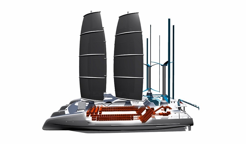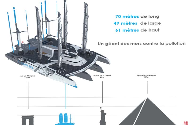 Ce navire révolutionnaire combinera les énergies renouvelables pour atteindre une autonomie totale, et accueillera en son sein une véritable usine de tri, compression et stockage des déchets plastiques récoltés (plus de 250 tonnes de déchets pourront être stockées dans ses coques avant d’être rapatriées sur terre).