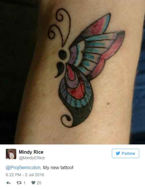 Une interprétation qui prend tout son sens à la lumière du projet « Point-Virgule » (Projet Semicolon) dans les pays anglo-saxons, où un tatouage représentant ce signe de ponctuation est devenu le symbole de la solidarité envers tous ceux qui souffrent de dépression et de pensées suicidaires.