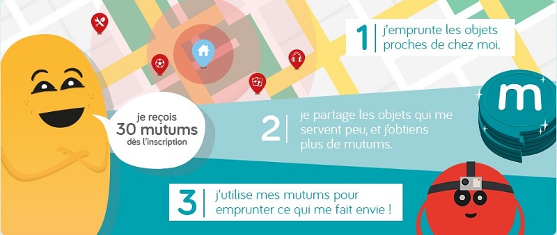 Prêter ou emprunter gratuitement des objets est en pleine mutation : le réseau participatif et gratuit pour tous Mutum propose le prêt et l’emprunt d’objets entre particuliers de manière simple et sécurisée, qu’il s’agisse de livres, d’une caméra, d’un appareil à crêpes, d’un vélo, d’une perceuse ou d’une tente… Sur la plateforme, pas d’argent mais une monnaie d’échange. A la différence de plateformes concurrentes comme E-Loue ou Zilok, Mutum se positionne sur le B2B, en proposant aux entreprises de construire des communautés à fort impact social. Côté utilisateurs, la jeune pousse propose à ses membres non pas de rentabiliser les biens possédés, mais plutôt de construire un portefeuille de Mutum, la monnaie interne à la plateforme, permettant d’échanger ses biens. Quand il s’inscrit, ajoute ou prête un objet, parraine quelqu’un, l’internaute remporte des Mutums. Ils lui permettent d’emprunter gratuitement à son tour des objets au plus près de chez lui grâce au système de géolocalisation du site.