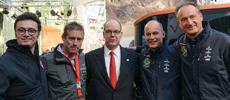 Photo : Gildo Pallanca Pastor, Raphaël Domjan, le Prince Albert II de Monaco, Bertrand Piccard et André Borschberg (les deux pilotes de Solar Impulse). ©Igor Lubinetsky /Hopscotch/Photoproevent