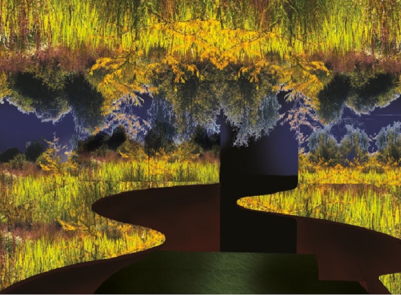 secs ou stabilisés, suspendus, recréant un carré de prairie à l’envers. Les murs sont recouverts de miroirs, étendant cette représentation du jardin à l’infini. Au sol, de grandes tables courbes invitent les visiteurs à suivre un parcours sinueux. Recouvertes également de miroirs, elles créent l’illusion d’un autre jardin, où les végétaux semblent s’élever vers le ciel, projetant le visiteur en lévitation.