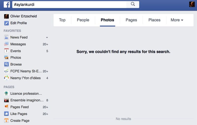Le Jeudi 3 septembre 2015, la requête « Aylan Kurdi » ne ramène aucune image dans la partie dédiée du moteur de recherche de Facebook.