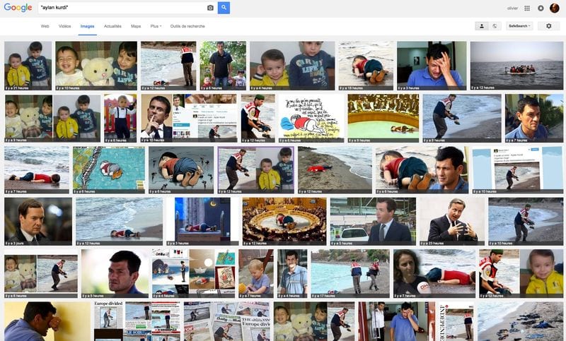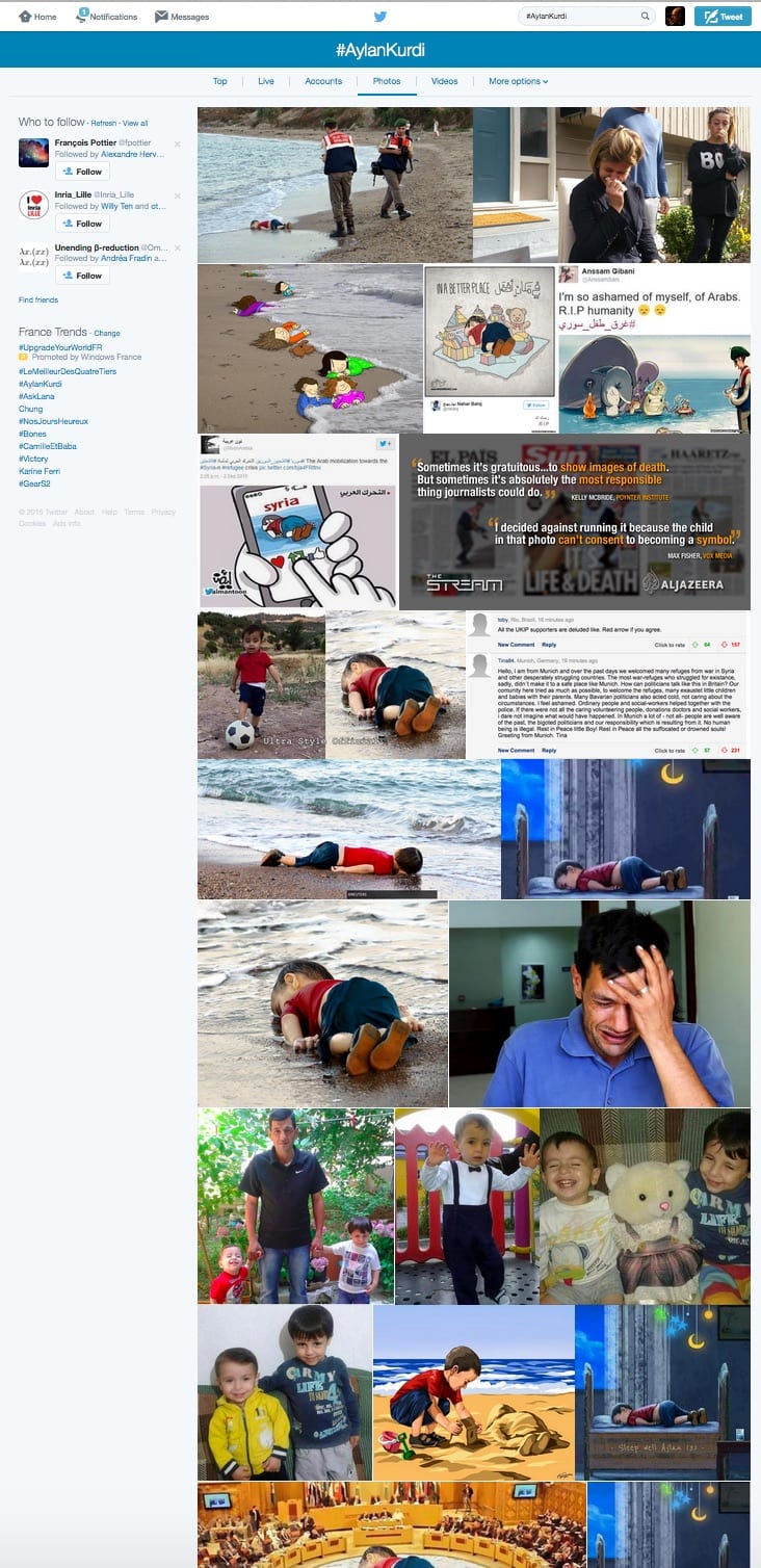 D’autant qu’à regarder du côté des autres « murs d’image » de Twitter ou de Google, la question ne se pose même pas. Les photos d’Aylan, la photo d’Aylan est là, en évidence, ainsi que l’ensemble des éléments de réappropriation, de recontextualisation qui permettent de documenter ce fait, cette sinistre réalité.