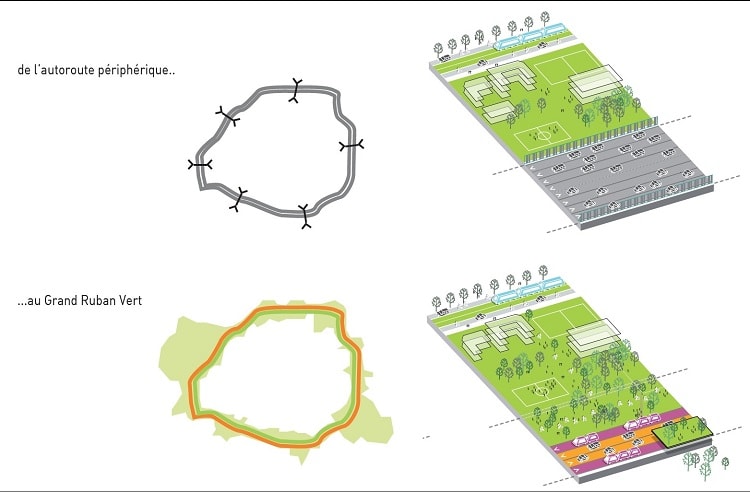 Ainsi, le périphérique deviendrait, à l’horizon 2050, un grand boulevard métropolitain, avec un trafic réduit de moitié, 50 % de ces voiries étant réservés à la végétalisation.