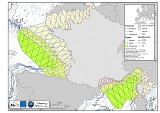 ▪ Une stratification en fonction des principales catégories bathymétriques : plateau continental, talus et domaine océanique pour décrire la distribution globale des animaux et une strate côtière pour établir un état initial des sites Natura 2000 existants contenus principalement dans les eaux territoriales (12 milles nautiques)
