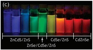 Photos : Fluorescence (sous UV) de boites quantiques de diverses tailles.