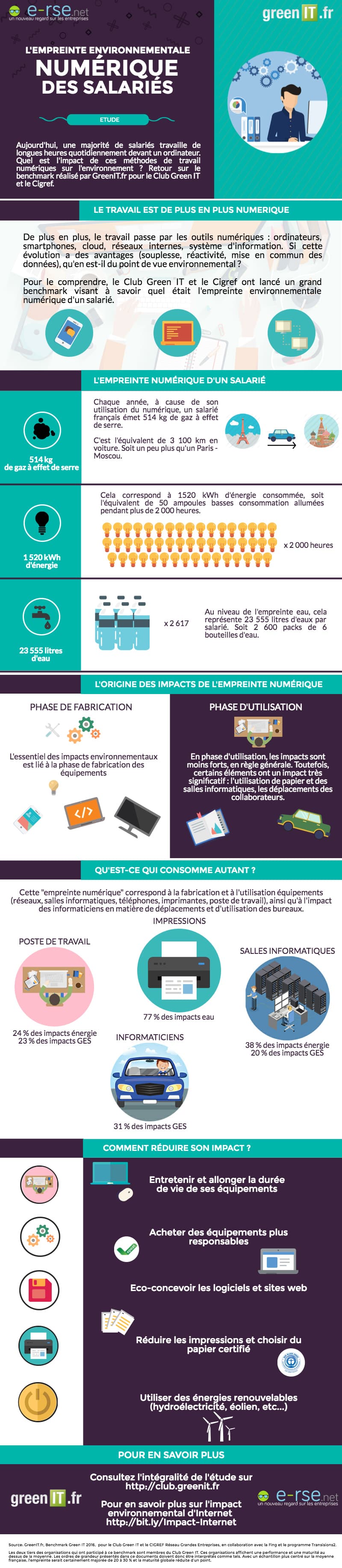 Aujourd’hui une majorité de salariés français travaille de longues heures quotidiennement devant un ordinateur. Quel est l’impact de ces méthodes de travail numérique sur l’environnement ? Retour en infographie sur l’étude réalisée par GreenIT.fr pour le Club Green IT et le Cigref.