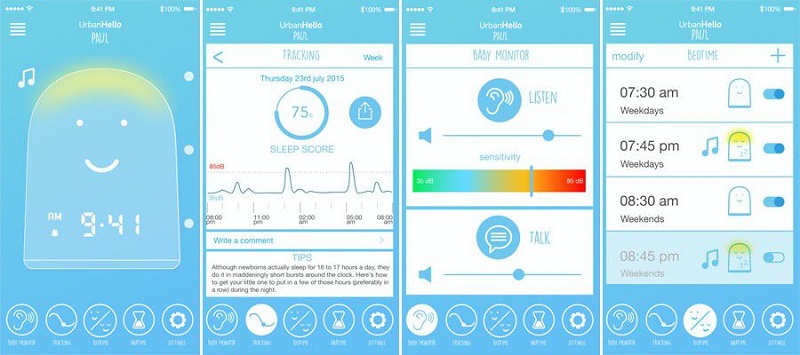Toujours grâce à la connexion Bluetooth et à l’aide du haut-parleur dont il est équipé, le réveil est en mesure de jouer les berceuses préférées des enfants que leurs parents auront pris soin de stocker sur leur smartphone ou leur tablette. L’application permet également de régler l’heure, la couleur et l’intensité de la veilleuse, de n’afficher que le visage en masquant l’heure, de régler le volume de la musique, …