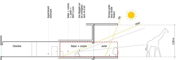 L’organisation en quinconce des terrasses est fondamentale. Sans ce principe il serait impossible de superposer de grandes terrasses sur toute la hauteur d’un bâtiment, chacune d’entre elles occultant la lumière de celle du dessous. La disposition en quinconce a d’abord pour effet d’installer, en alternance, une terrasse tous les deux étages, ce qui laisse largement passer la lumière tout en « oubliant » le voisin du dessus perché près de 6 mètres plus haut.