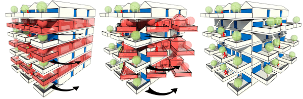 Directement inspiré des végétaux dont les feuilles s’organisent en quinconce pour capter la lumière sans se gêner, le concept Rubixhome propose des immeubles dont les terrasses s’organisent sur tout le volume, offrant 25m2 de plein air à chaque occupant, à des conditions économiques abordables.