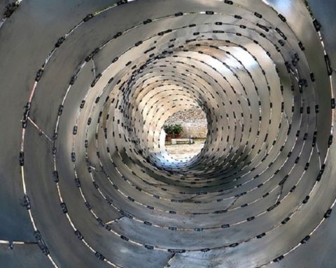 Metal Euplectella Folie est un prototype qui explore une méthode innovante de conception et de fabrication pour une architecture sur-mesure. La couture de quatre laizes d’acier de 40m de long, chacune découpée selon un patron unique puis enroulée en spirale, permet la réalisation d’une forme complexe sans réglage, sans plan