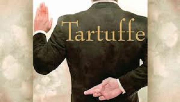 Tartuffe met en scène un faux dévot qui ne cesse de prier et d’invoquer les intérêts du Ciel.[1] Sous le couvert de la religion, le personnage principal convoite, et la femme de l’hôte, et sa fortune. Au nom du Ciel où il entend se placer, il se réjouit de pouvoir s’approprier les intérêts bien matériels de ses contemporains. Tartuffe est la comédie de l’imposture par excellence.