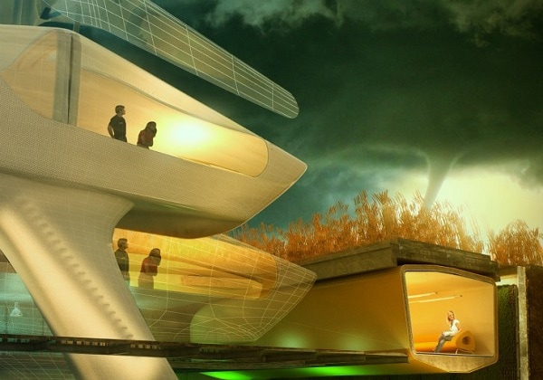 Trop souvent, les catastrophes naturelles sont considérées comme accidentelles et ne sont pas anticipées. L’agence IO cherche à concevoir une architecture sensible à son contexte naturel, y compris en incluant la « probabilité » de catastrophe. Ce projet avait été pensé comme moyen de redessiner un paysage et a abouti sur un nouveau concept de banlieue pour les zones de tornade du Mid-West américain. Une conception influencée par les idées cinétiques des portes de garage ou des coques de voiliers.