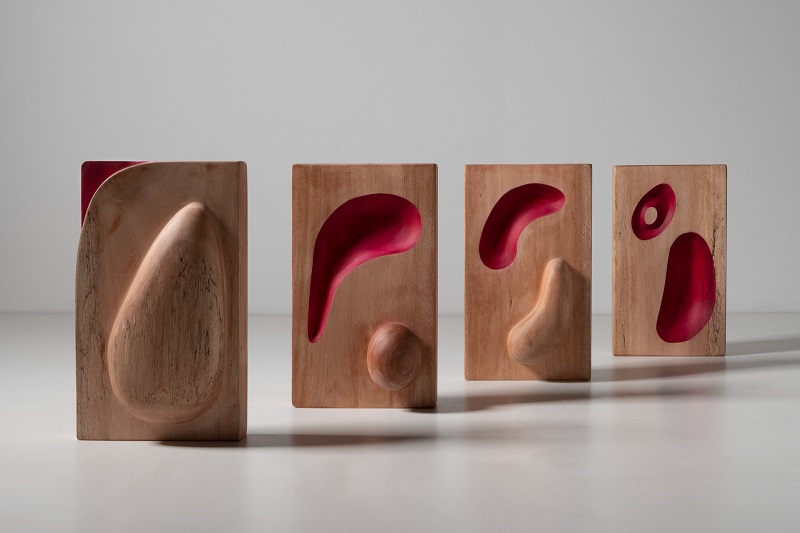 Au rez-de-chaussée, l’exposition s’ouvre sur un espace évoquant l’atelier de Brancusi, où les sculptures de Mauro Mori sont présentées en empilement à la façon du maître où une sculpture devient socle pour une autre sculpture. Travaillant principalement le bois d’Albizia Rosa, une essence locale des Seychelles à la croissance envahissante, Mauro Mori sculpte la matière dans le respect de son histoire et de sa structure. Ses sculptures – tables d’appoint en bois ou en pierre, au dessin immédiatement identifiable – deviennent socles pour ses sculptures en marbre, telles Hoor et Both, elles-mêmes sculptures hiératiques ou en mouvement. Red Variations, ensemble de quatre éléments, installation murale ou à poser, prolonge cette réflexion en explorant une biologie imaginaire et une abstraction organique, en résonance directe avec l’univers brancusien. En écho, deux photographies abstraites de Dan Er. Grigorescu du Torse de Brancusi viennent intensifier l’atmosphère brancusienne de l’exposition et rappeler les duos de Scarpa.