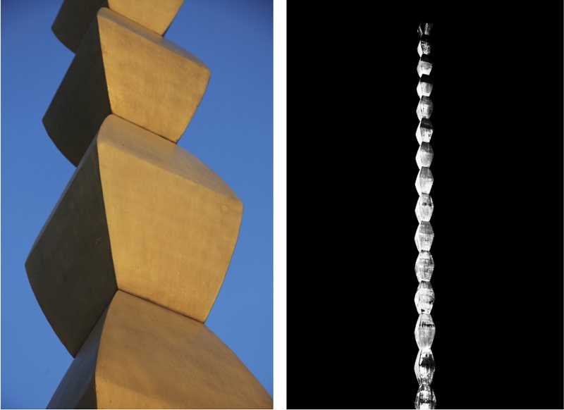 Enfin, au dernier étage, le duo devient celui des séries de photographies noir et blanc de Dan Er. Grigorescu dialogue avec celle en couleurs de Mircea Cantor, toutes deux consacrées à l’installation monumentale de Brancusi à Târgu Jiu. Ce face-à-face photographique met en lumière la dimension spatiale et monumentale de l’œuvre de Brancusi, pensée comme un ensemble indissociable de sculpture, de parcours et de paysage, tout en révélant la manière dont différents regards de deux époques s’en emparent. Cette présentation accompagne la parution d’un ouvrage aux éditions EXB, consacré aux photographies de Mircea Cantor réalisées à Târgu Jiu et la réédition du livre de Dan Er. Grigorescu, prolongeant ainsi la réflexion engagée par l’exposition autour de la permanence et de l’actualité de la pensée brancusienne.