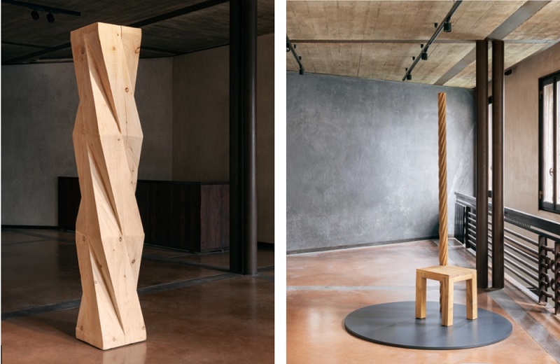 Le premier étage réunit des œuvres de Mircea Cantor et de Gianluca Pacchioni en présentant à chaque fois des duos d’œuvres. Les sculptures de Mircea Cantor s’inscrivent dans une réflexion profonde sur la transmission, la responsabilité et la verticalité morale. La série Add Verticality To Your Seat (To Socrates) est réalisée à partir de chênes et de cerisiers centenaires, collectés en Roumanie et sculptés dans la masse selon des techniques et des motifs traditionnels. Ces formes épurées, évoquant des chaises devenues figures, prennent la forme de portraits abstraits du philosophe Socrate, rappelant sa position d’accusé et sa condamnation pour ses idées. La verticale ajoutée à l’assise devient un symbole de résistance intellectuelle, faisant écho à la doctrine socratique du doute et à la parole comme acte fondateur.